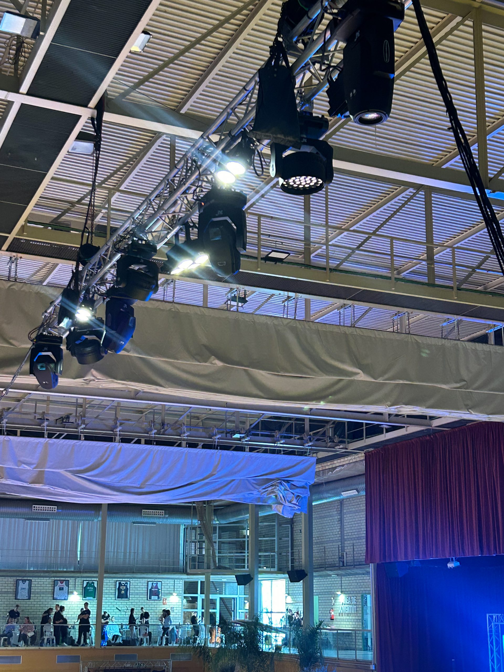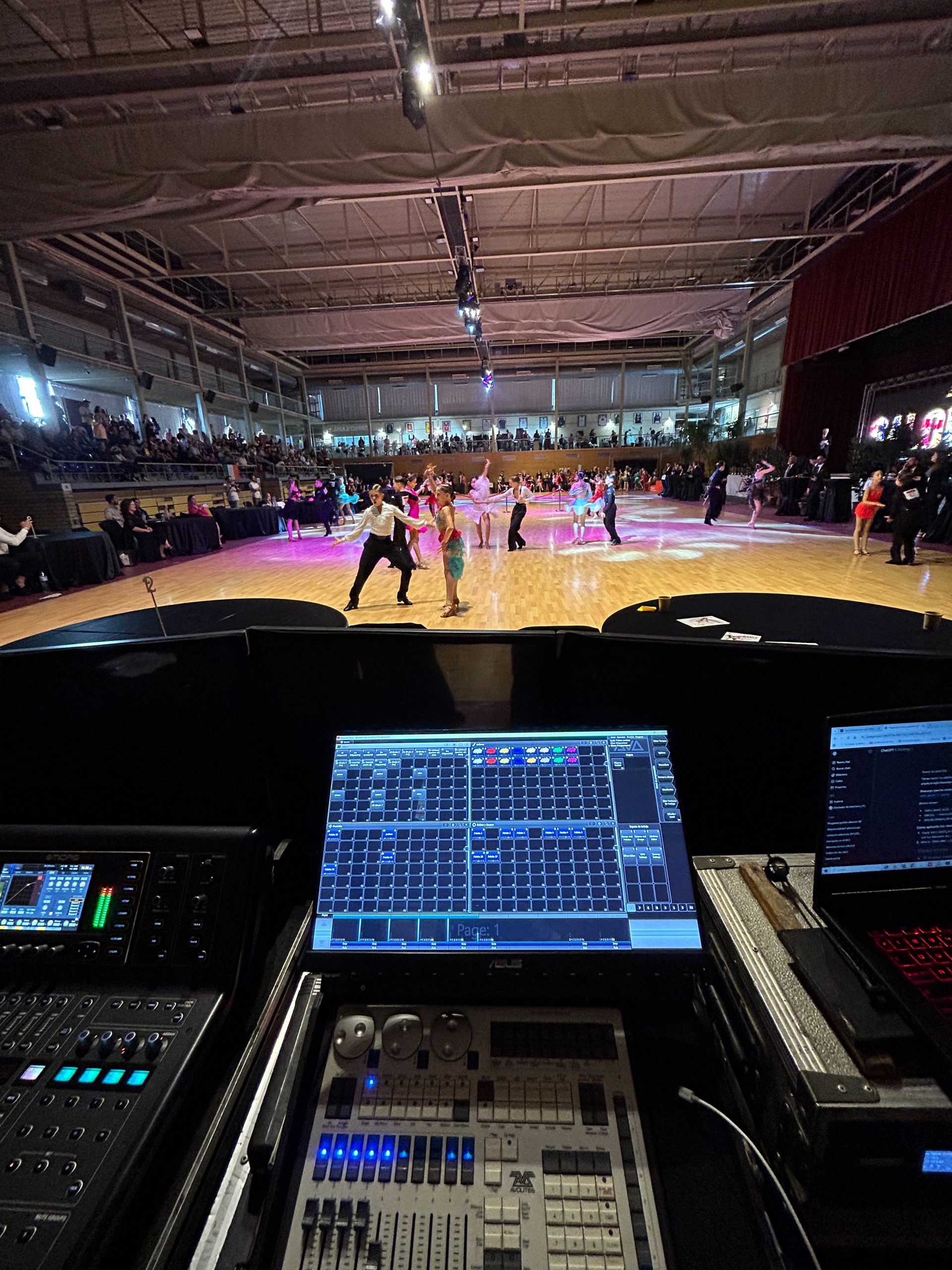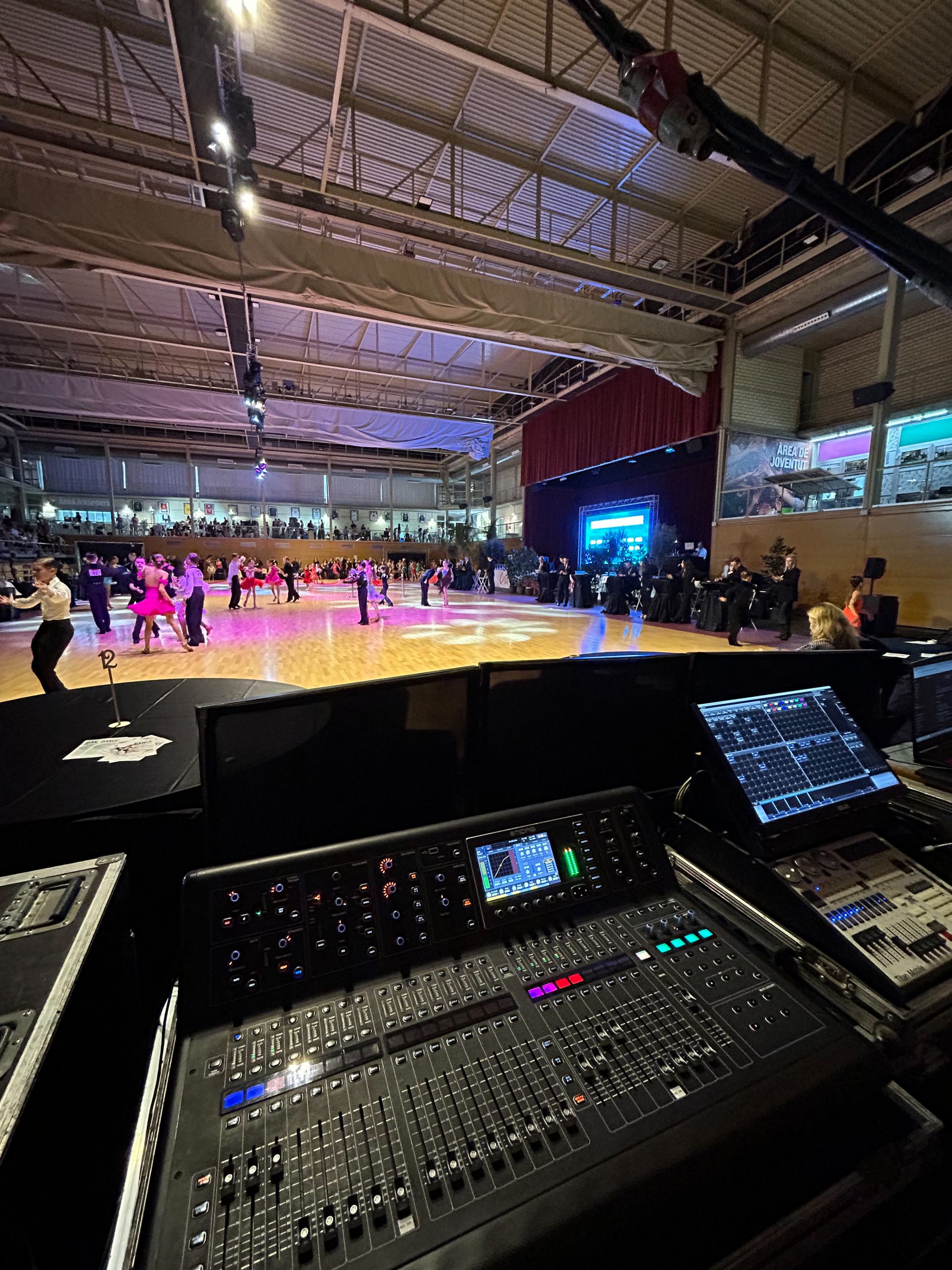 En el apartado de sonido, se ha previsto una distribución multizona y un sistema de microfonía inalámbrica para jurado, presentador y anunciadores, junto con altavoces de alta potencia que cubren homogéneamente el recinto, evitando distorsión y garantizando claridad incluso en momentos de máxima intensidad. La iluminación ha sido diseñada para modularse dinámicamente: focos LED con cambio de color, cabezas móviles y paneles de efectos permitan acompañar los diferentes estilos –desde la elegancia fluida del Standard hasta la energía vibrante del Latin– con transiciones escénicas impecables.