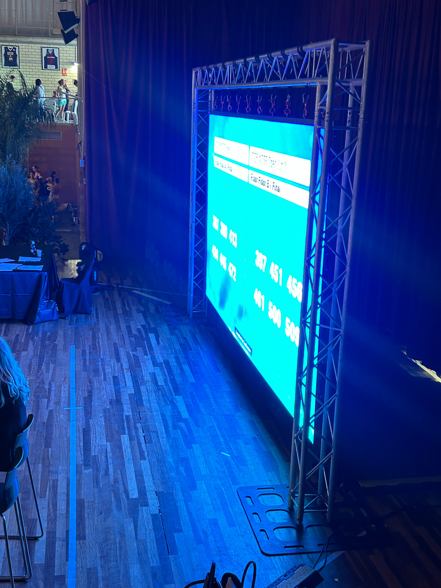 Las estructuras metálicas, elevadas a medida, sustentan trusses y rigging que permiten la instalación de luminarias, cámaras y pantallas sin comprometer la visibilidad del público ni la seguridad del montaje. Las pantallas LED Screen 3.9, posicionadas en puntos estratégicos, permiten proyectar en directo los pasos de baile, resultados y contenido promocional con resolución óptima, generando un impacto visual que potencia la atmósfera competitiva y de espectáculo.