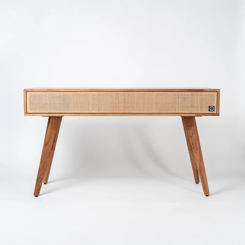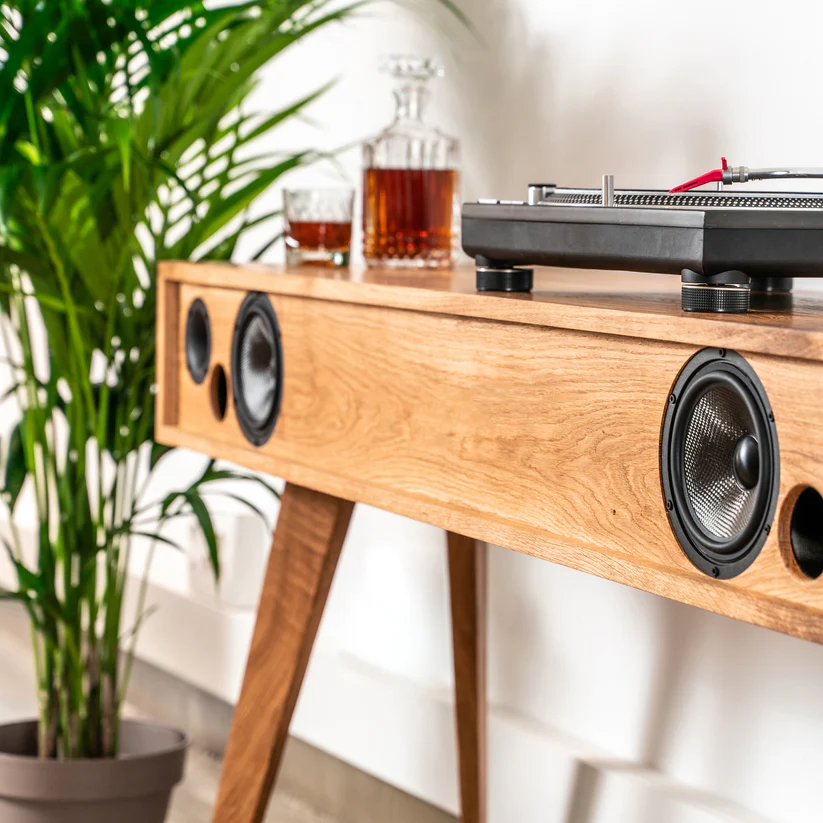 Exterior made from locally sourced solid oak wood with PEFC and FSC certification, treated with natural oils. Interior enclosures manufactured with birch plywood and phenolic glue. Handcrafted front frame made from eco-friendly rattan core fabric or fire-retardant polypropylene acoustic fabric.